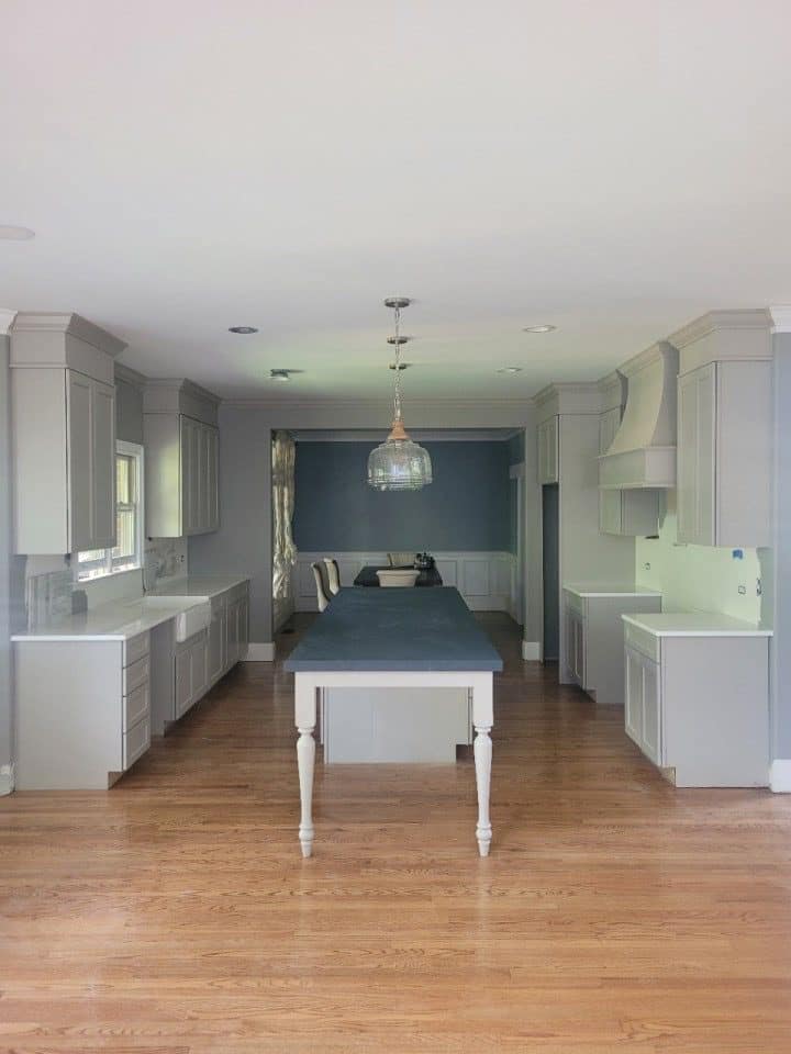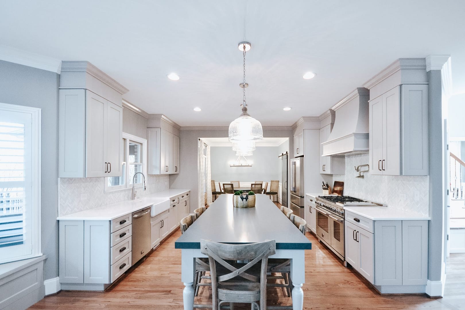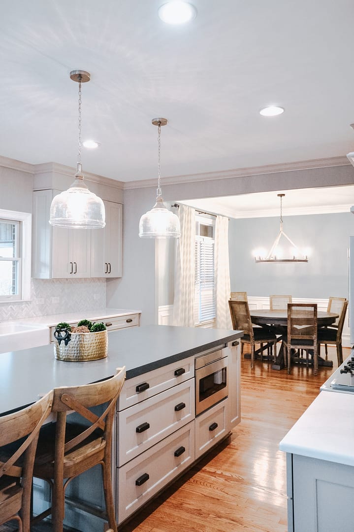 The renovation started like every good project does: demo. Our team removed the old cabinetry and created a larger cased opening between the kitchen and dining area. New cabinets from Dixie Kitchen were installed in a light gray color to bring some light into the space. The style of the cabinetry gives a more current feel, but some traditional elements kept the kitchen true to the original design of the home. An extended island with a dark gray quartz countertop was installed, creating plenty of work space and room for the family to gather.