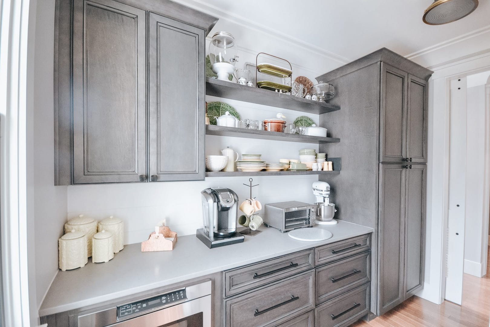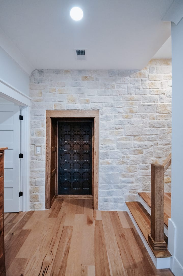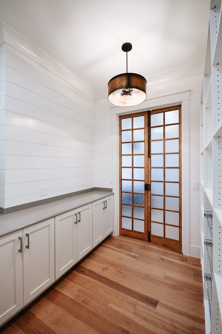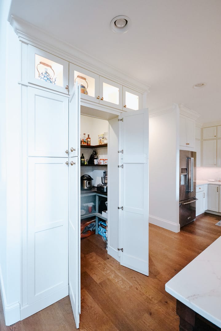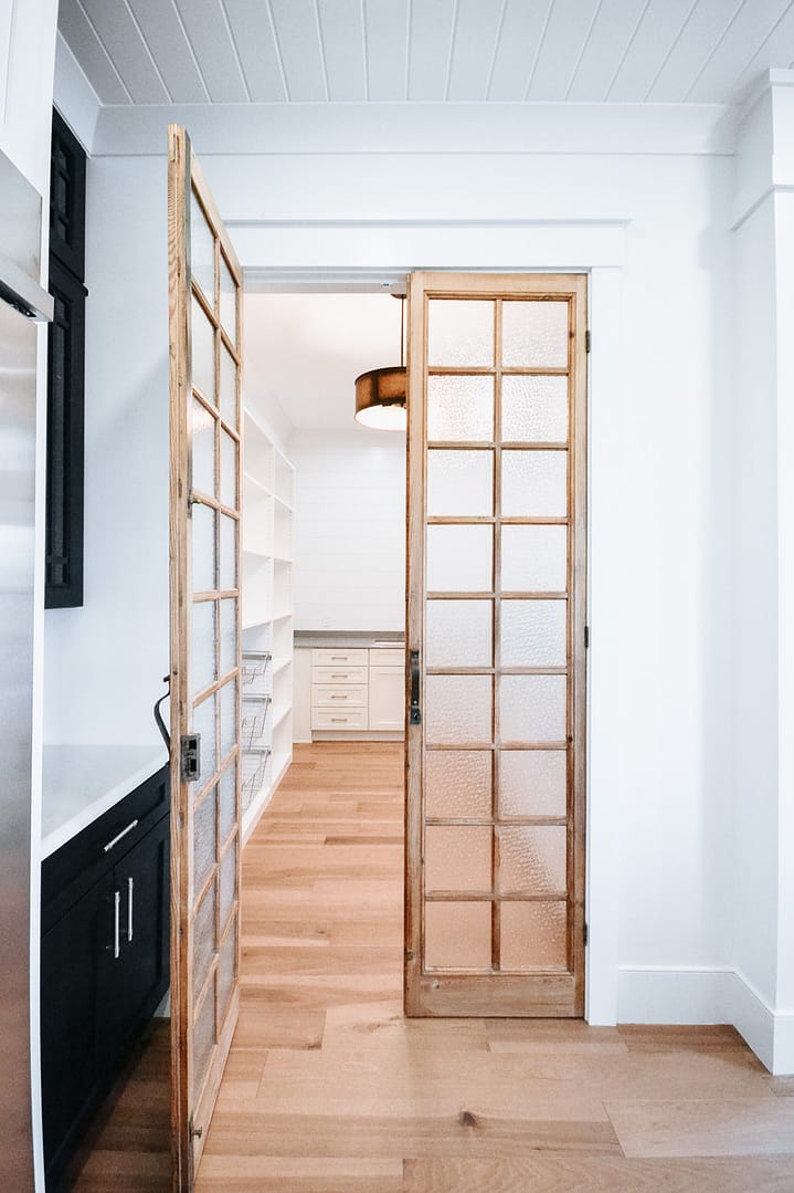 Our Keller Bend custom home is full of refined design choices that create a lovely, elegant home, so you may be surprised when the kitchen cabinets open to reveal a hidden walk-in pantry. Custom cabinetry made a way for this design to integrate seamlessly into our clients’ kitchen without robbing them of the walk-in pantry they needed.