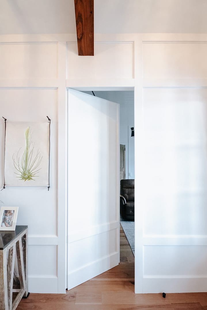 While these bold choices pack a punch, a more subtle custom detail is on the rise. The inner child in each of us loves a hidden door, so why not have a sophisticated version in your very own grown-up playhouse? For our Contemporary in the Country clients, a traditional door in the entryway would have disrupted their paneled wall treatment that creates a beautiful statement upon entry into their home. Our team designed a way for the office door to disappear into the trim, giving our clients a fun secret to share with their visitors.