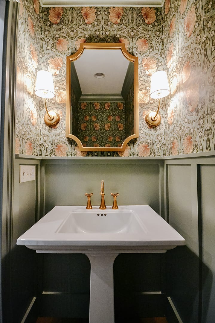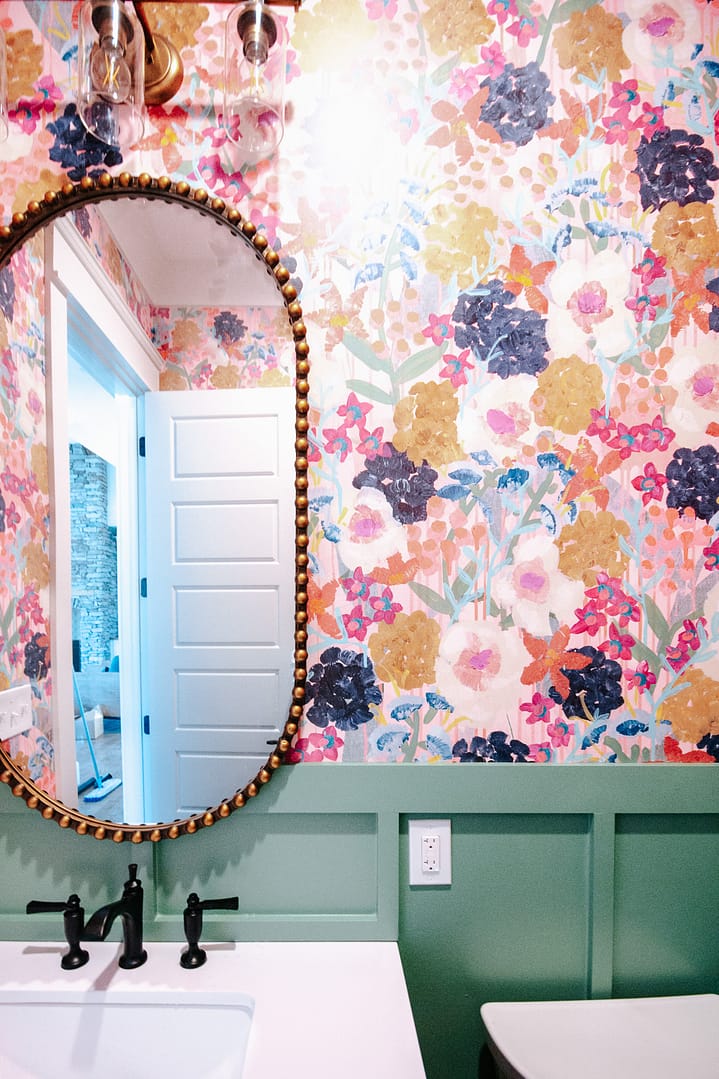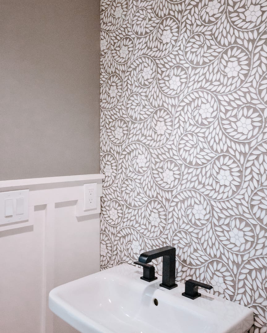 One way to incorporate bold elements into a home is through the powder room. This idea is nothing new, but a few of our recent powder rooms have left us with a new love for this small-but-mighty space. The combination of wallpaper with board and batten is a crowd favorite, whether our clients want a pop of color, a bold pattern, or both. Last week, we completed a home in Tennessee National with textured grasscloth wallpaper in a beautiful moody shade, and another home features a statement wall of floor-to-ceiling marble tile.