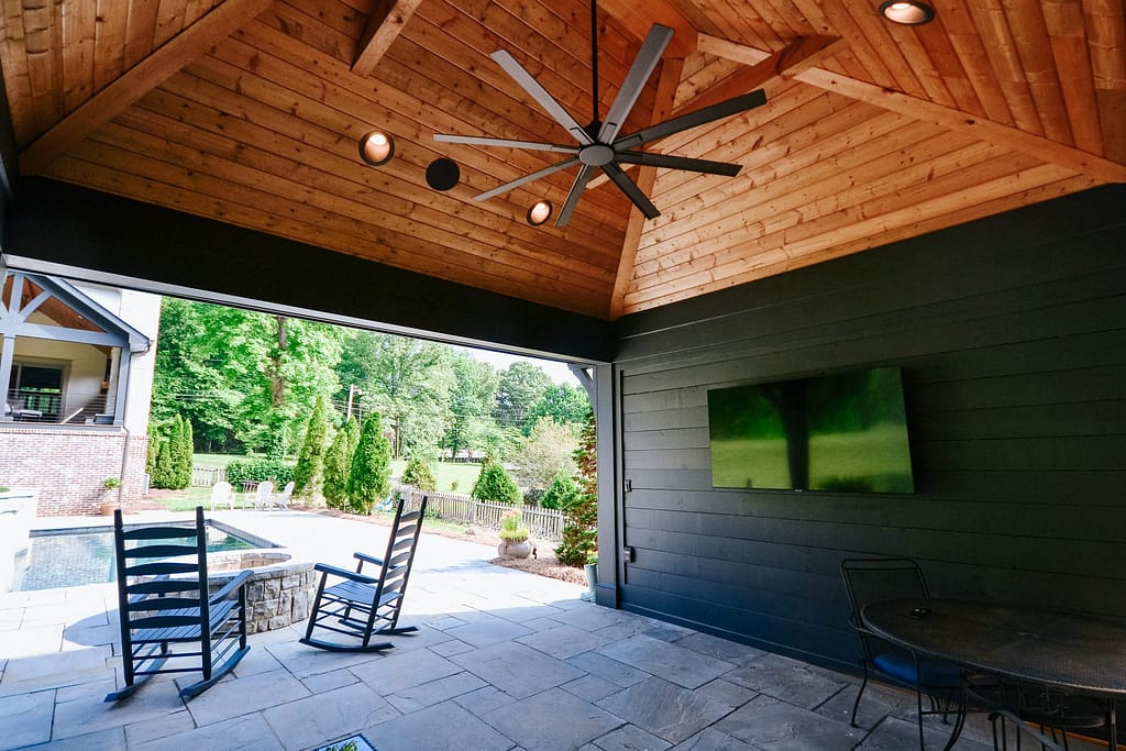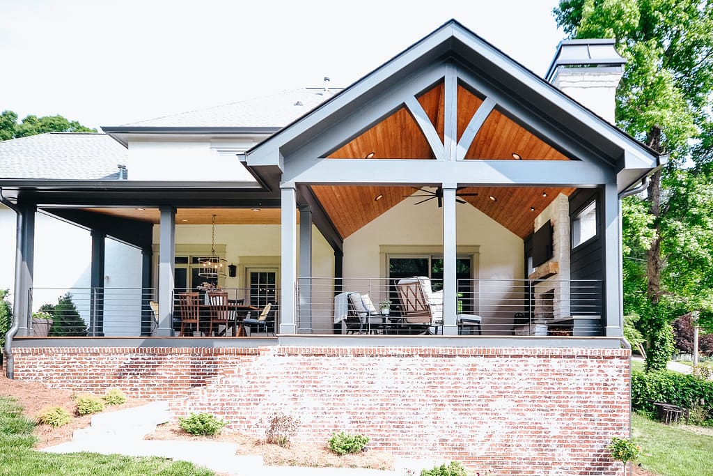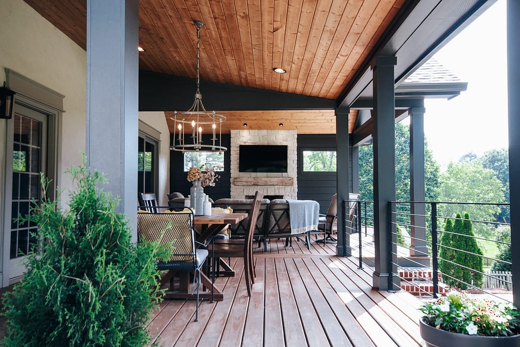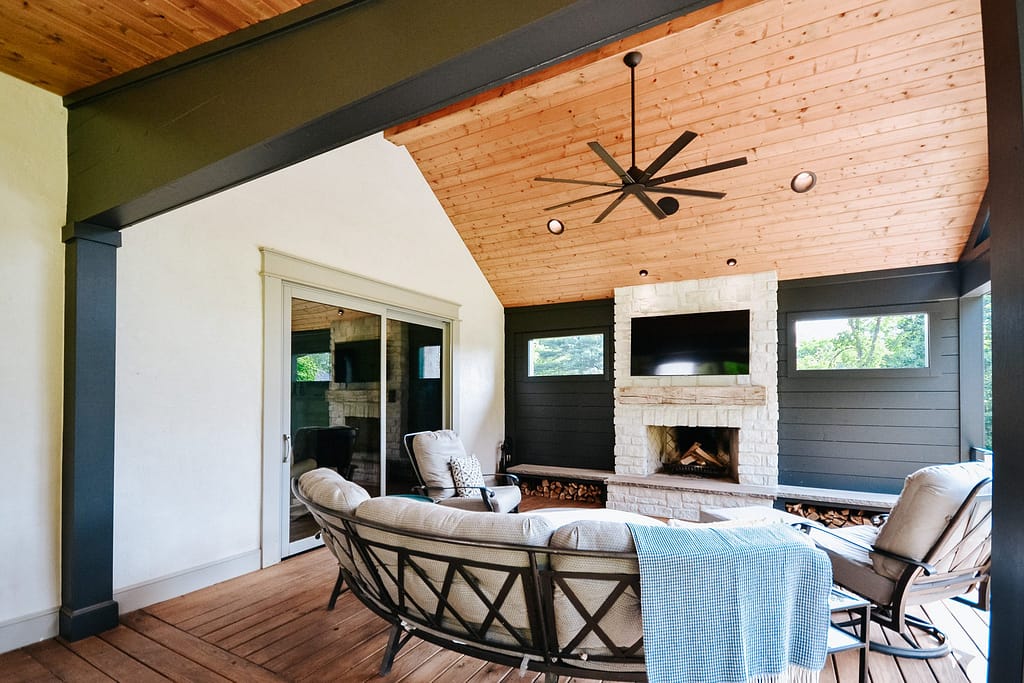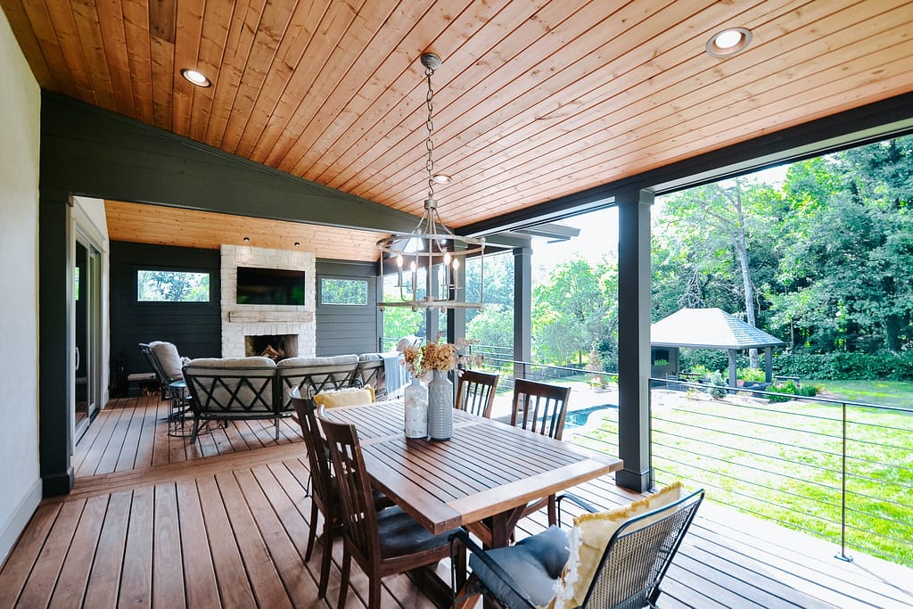 The next phase of this project gave their back porch a major overhaul. What was a simple covered deck is now an indoor-outdoor living space that seamlessly ties the entire project together. The tongue and groove ceiling and dark trim mirror the pavilion, making both spaces feel cohesive and intentional. Their new porch was designed as an outdoor living + dining space. Centered around the stone fireplace and outdoor TV is a cozy seating area, and an outdoor dining table is the perfect spot for family dinners overlooking their new backyard. Vaulted ceilings and thin iron railing keep the space feeling open and integrated with the pool and pavilion areas.
