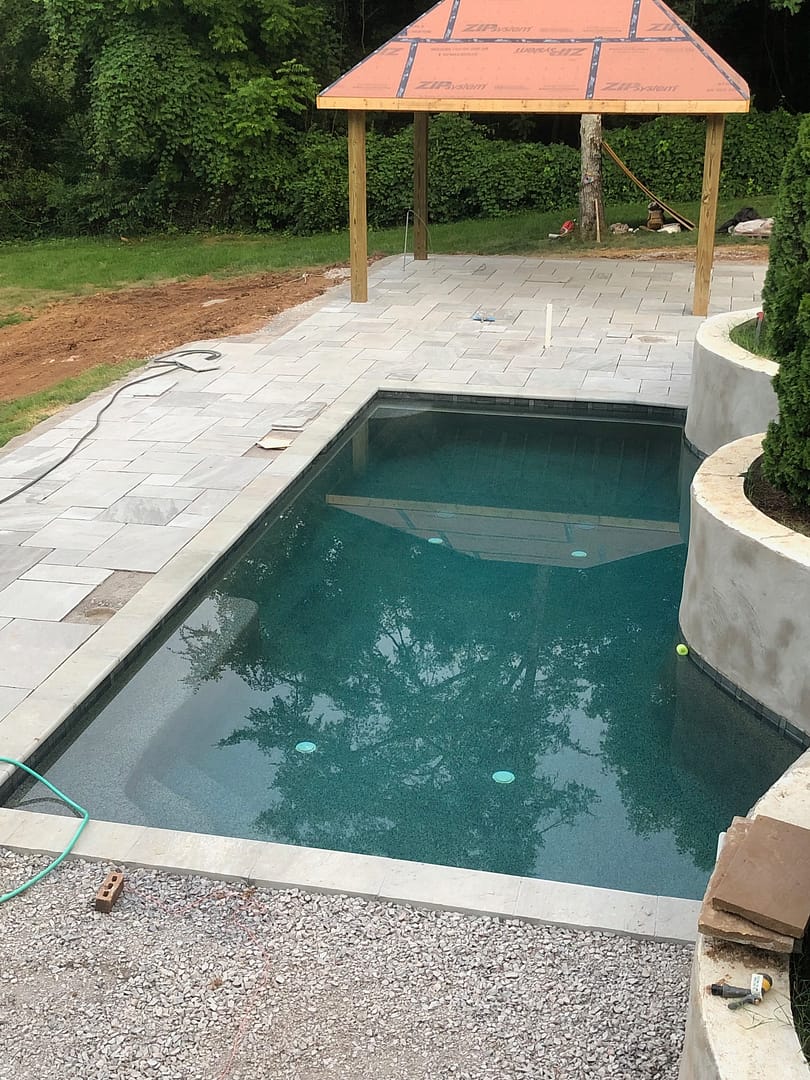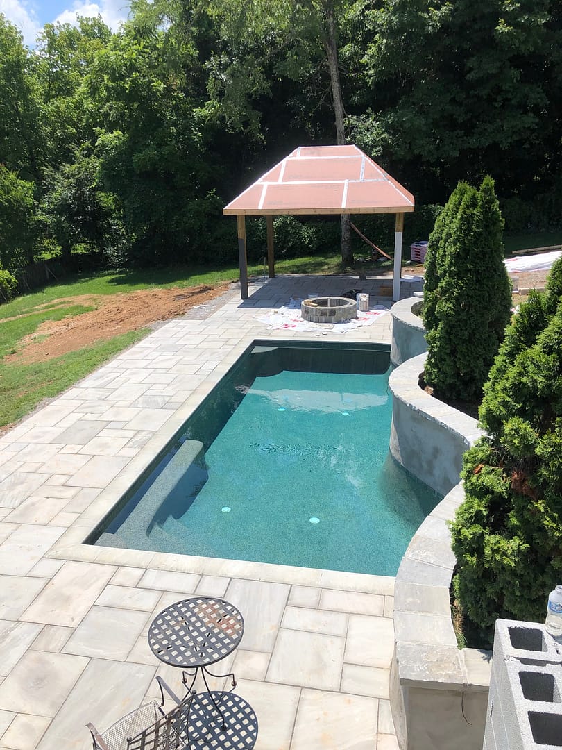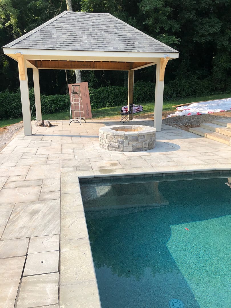 The project began with an upgrade for the existing pool. New stone pavers on the pool deck made a drastic improvement to begin with. New finishes for the pool and curved wall tie in with the home’s creamy stucco finish. The pavilion and firepit addition came next. This new structure provides a shaded spot to relax while the kids swim or run around in the backyard. It’s the perfect addition for entertaining on a hot, summer day, watching the Vols play or roasting marshmallows by the fire, creating year-round enjoyment for this family!