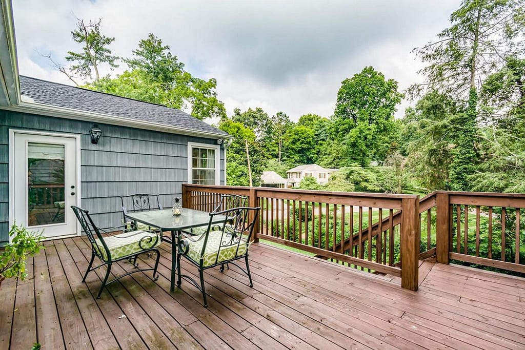 Sitting on a sloped lot, the two-story rear elevation saw many changes as well. The existing back deck was replaced by the sunroom in the addition, and a new deck with metal railing gives the new outdoor living space a more modern look. The new primary bedroom and basement below look out onto their backyard through large windows that were selected to match the existing ones throughout the house.