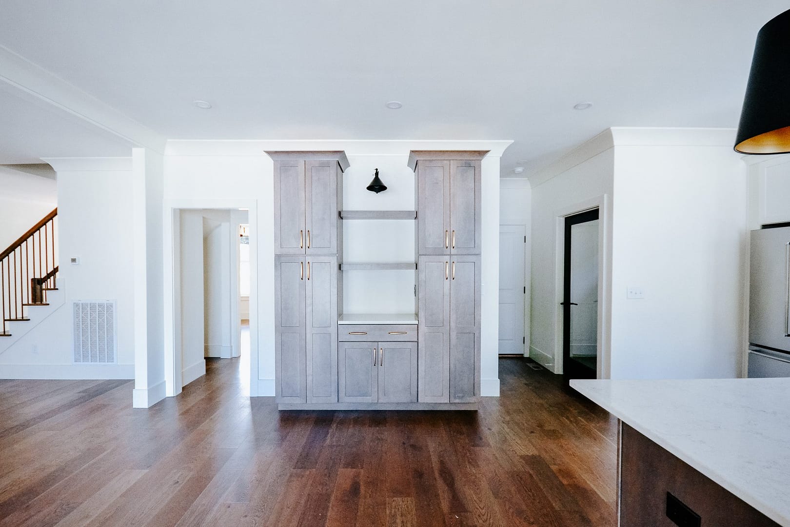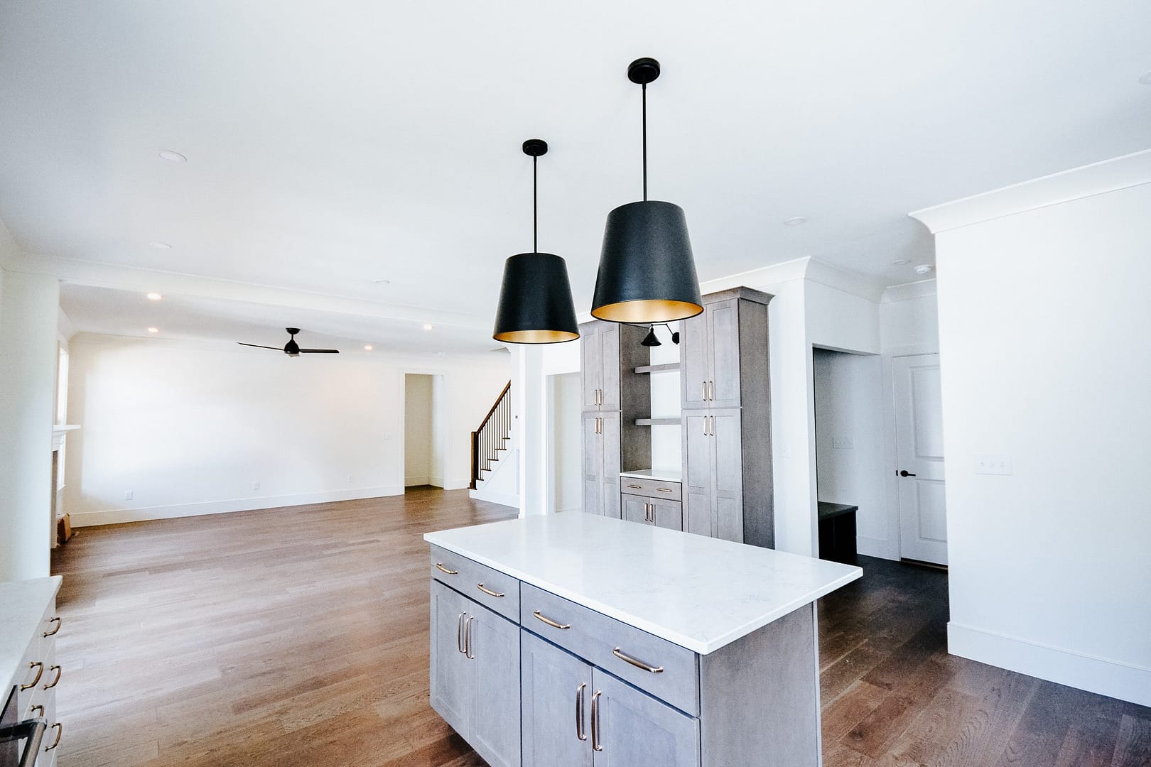 The kitchen is functional and spacious, designed by McCamy designer, Ashley Jones. She chose shaker-style cabinets, marble backsplash, and a mix of black and gold fixtures. Plenty of cabinet space, including a coffee bar area and pantry storage, makes this kitchen as practical as it is pretty!