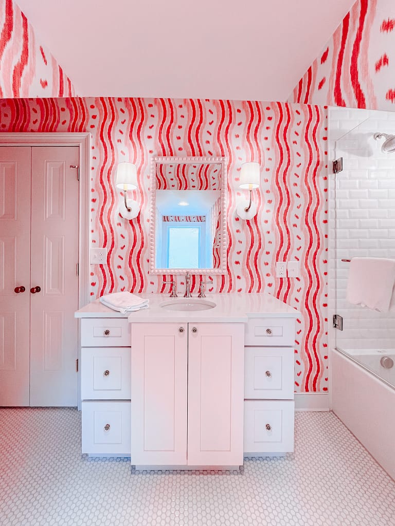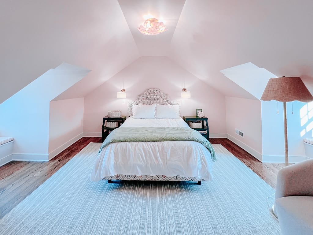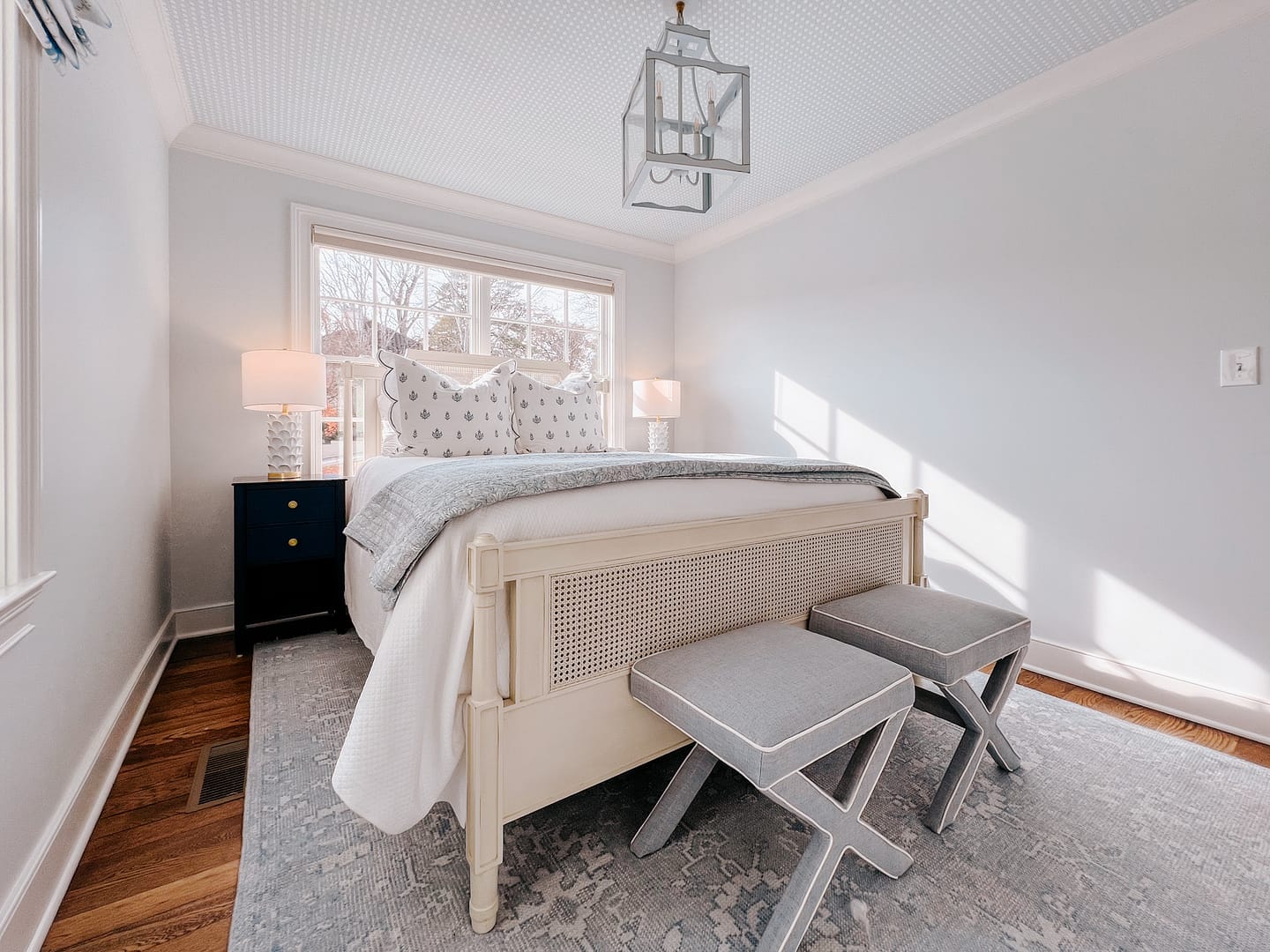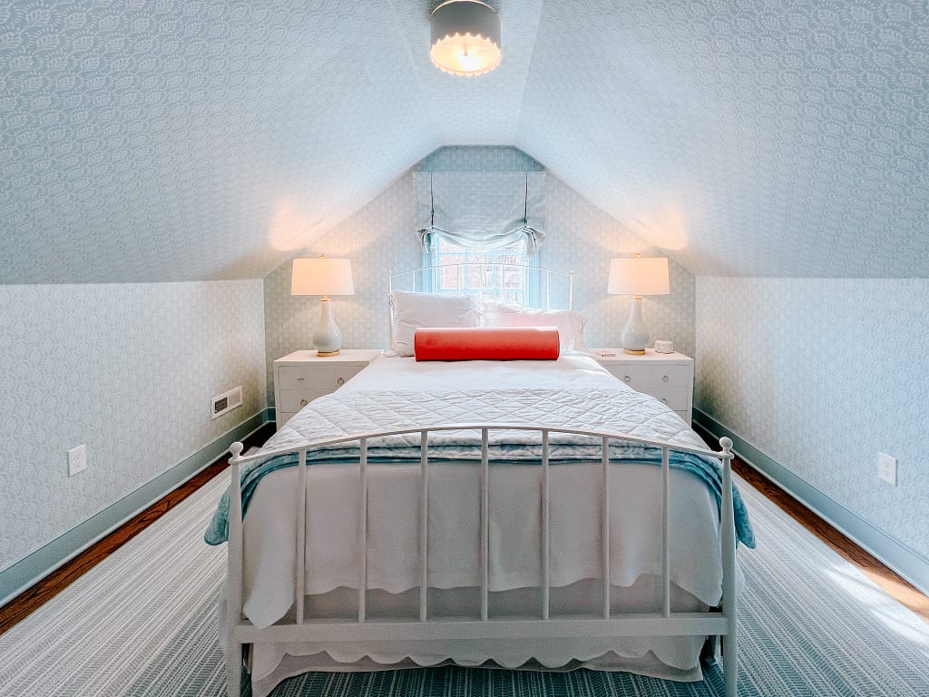 This home certainly isn’t short on charm. Each bedroom and bathroom incorporates just the right amount of color and pattern, bringing personality to every corner. With their daughters off at college, our clients wanted to give them a welcoming retreat to relax in when they’re home. By vaulting the upstairs ceilings, a whole new life was brought to these rooms. “Two of the biggest visual impacts came from raising the ceiling in the living room and the upstairs,” says our clients. The result is a set of spaces that feel both playful and soothing.