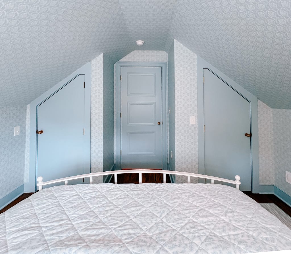 Downstairs, the guest bedroom and bathroom take on a more subtle palette. Soft blues create a calming environment for visitors while still connecting visually with the rest of the home. Even the laundry room gets its moment—geometric wallpaper adds energy and interest to a space that’s often overlooked.