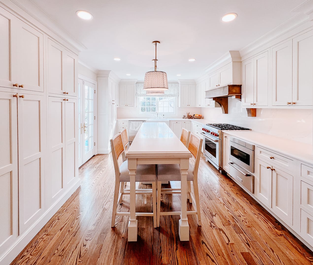 Natural light now pours into this updated kitchen. A generous island adds both workspace and a casual spot for family meals, making it a true gathering point in the home. The redesigned layout creates an ideal setting for crafting the family’s favorite festive dishes! With highlighted cabinetry, practical appliance cubbies, rustic French doors and a striking stove hood, our clients now consider this space their favorite part of the home. “I love my new kitchen! It was so fun to host our family and friends over Thanksgiving”, says our clients.