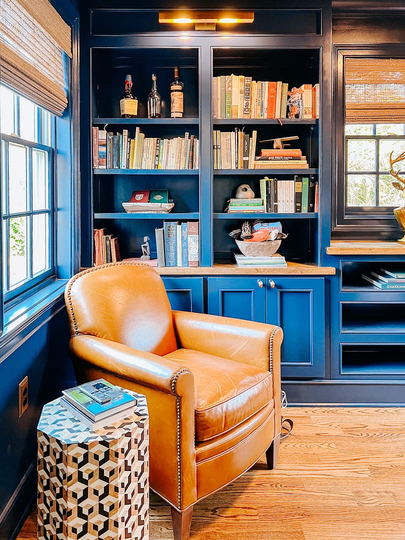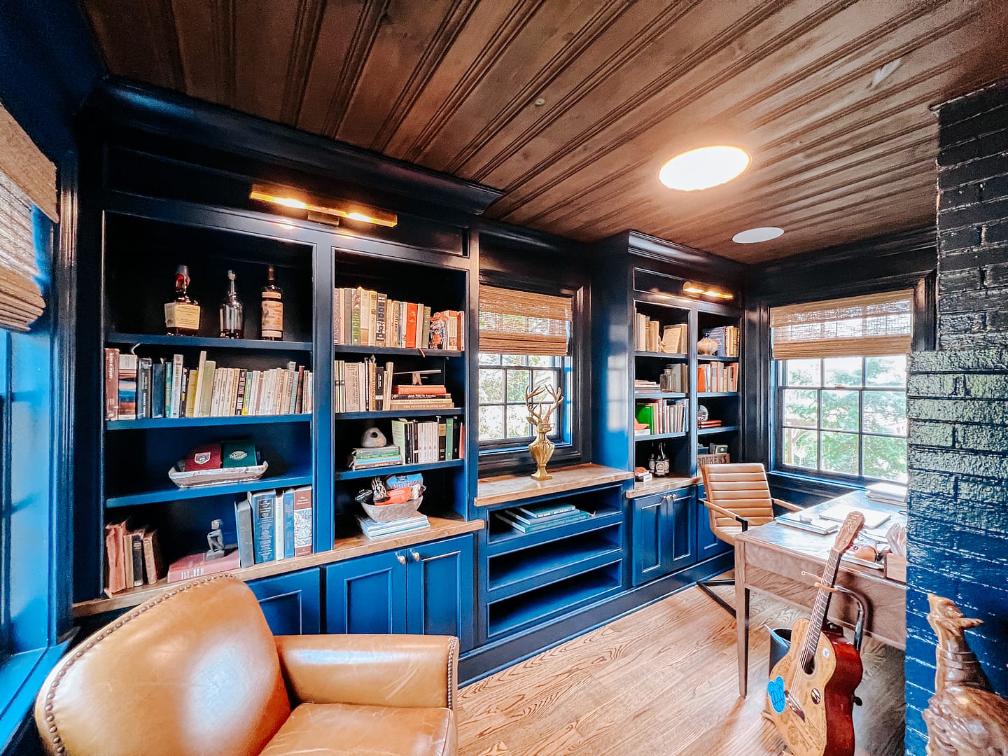 Just off the open family room sits a color-drenched office addition. Remnants of the original brick infuse the space with bold personality, creating a striking backdrop for work or creativity. The abundant shelving allows our clients to showcase all kinds of sweet and sentimental keepsakes. Custom built-ins bring essential functionality for daily convenience and storage to this fun, “Troy loves his office! Truly, all of it is beautiful!!”