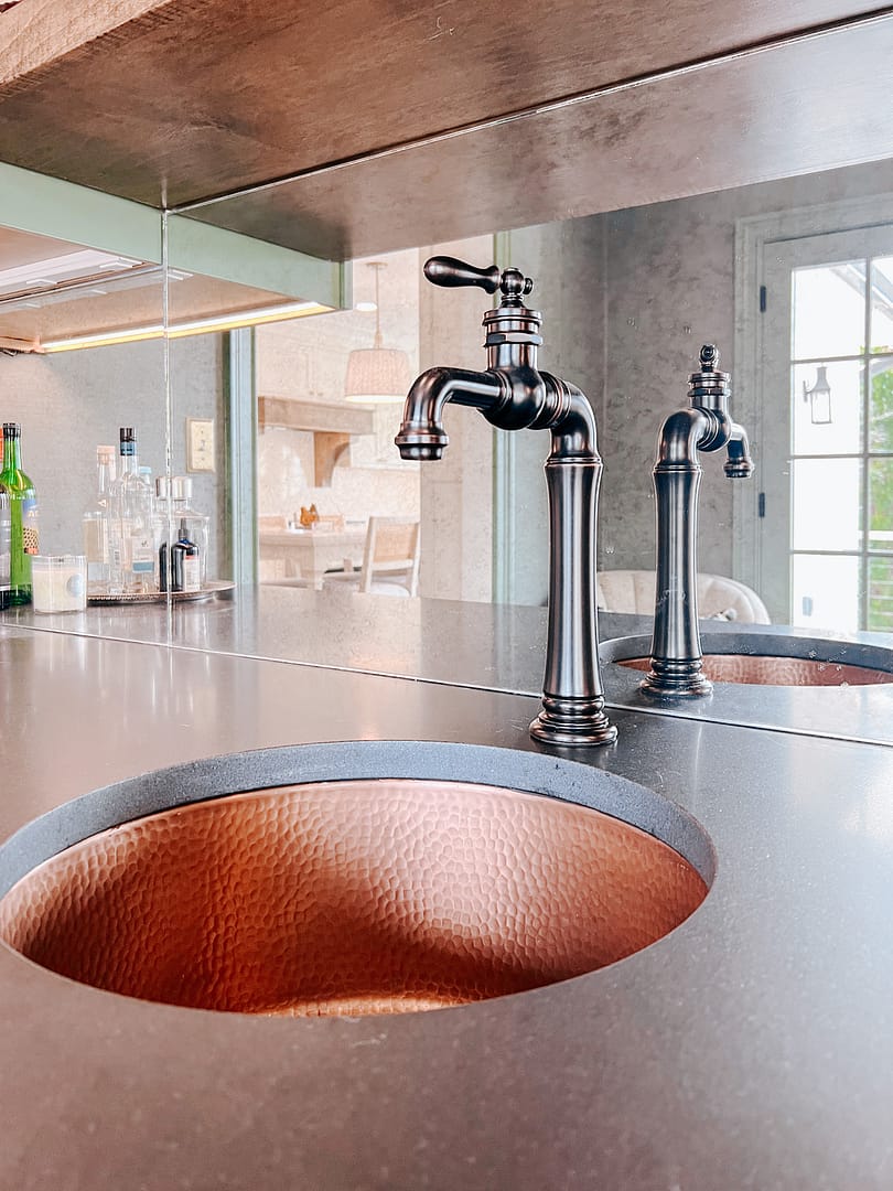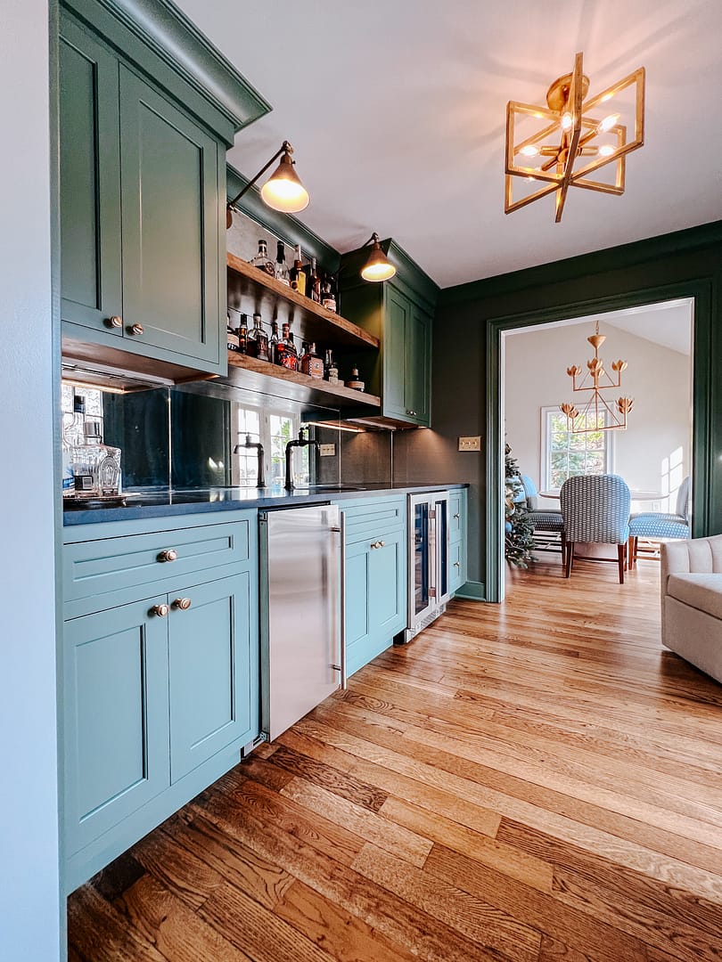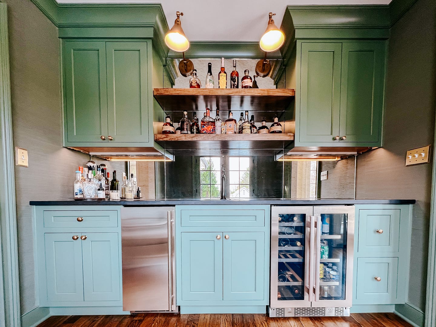 This bright white kitchen has a colorful counterpart just off the dining area. A stunning green bar serves as the perfect spot for entertaining guests and family, connecting seamlessly to the kitchen, living, and dining spaces. Much like the cocktails mixed here, the bar is filled with thoughtful, carefully crafted details.