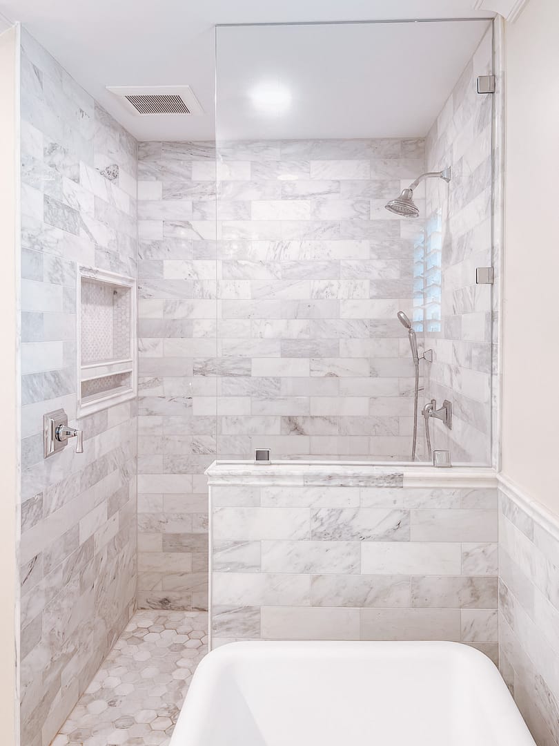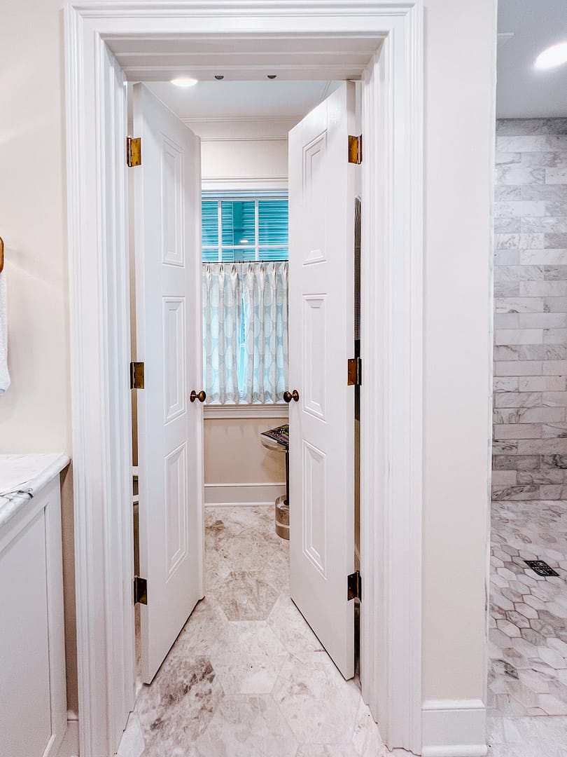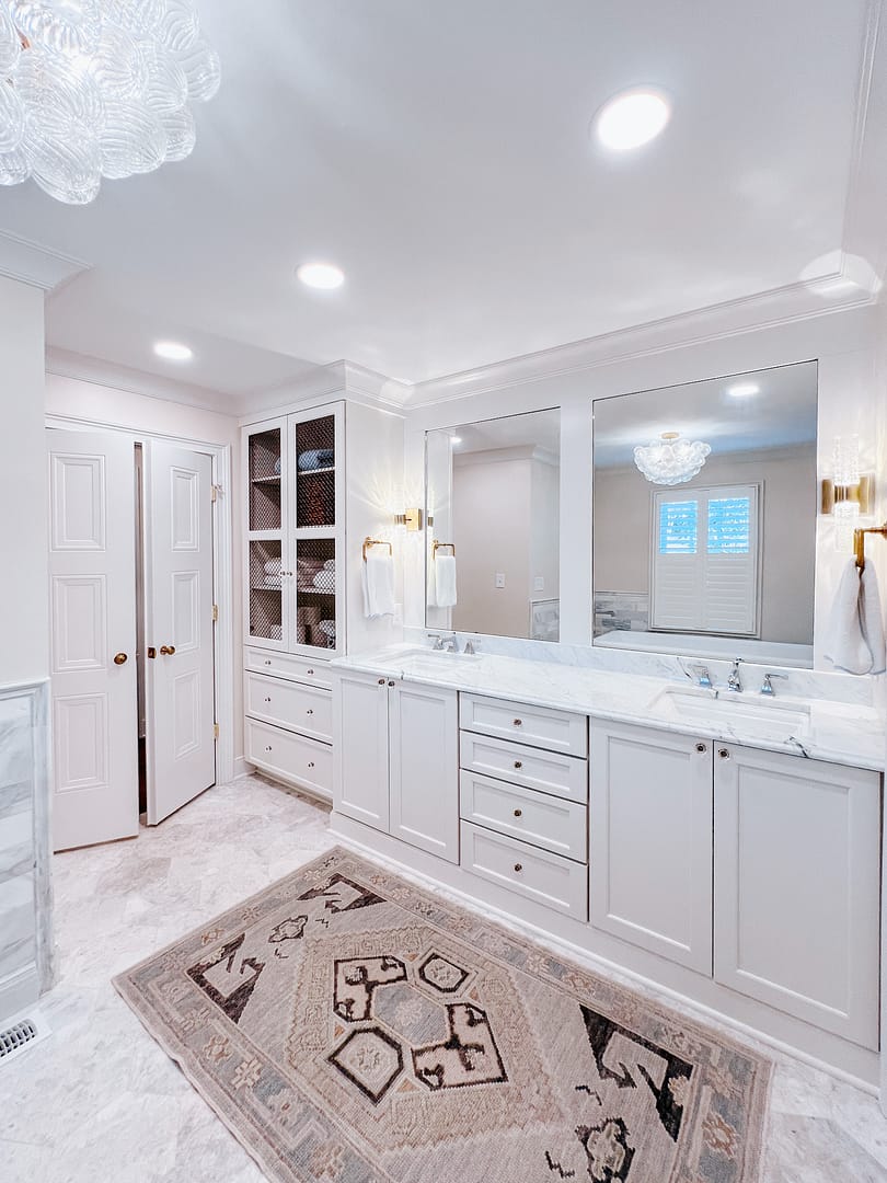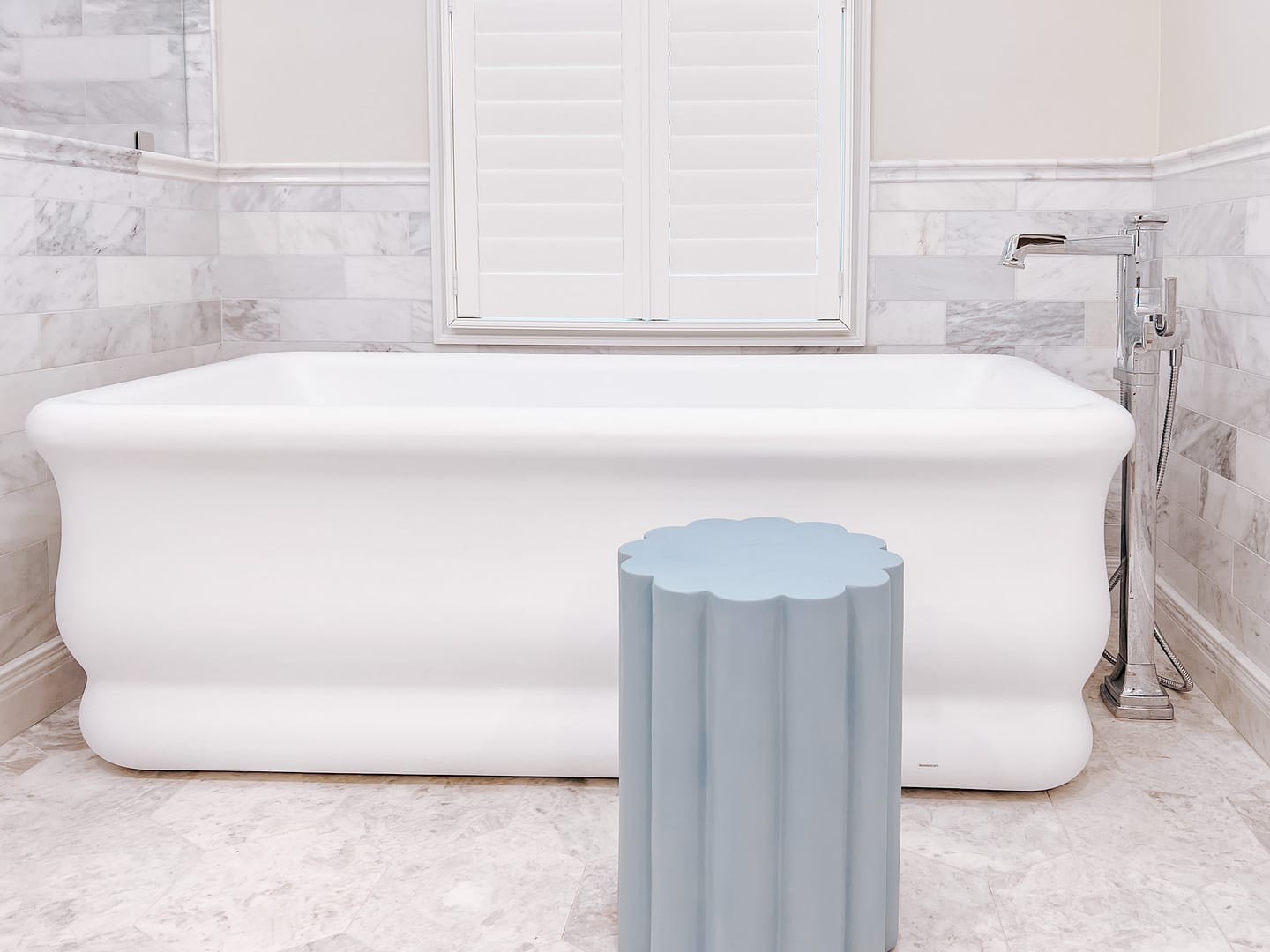 The primary bathroom offers a serene counterpoint to the home’s bolder design moments. Custom cabinetry, a walk-in shower, and a freestanding tub come together to form a bright, refined retreat with all the comforts our clients hoped for.