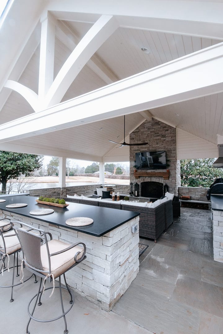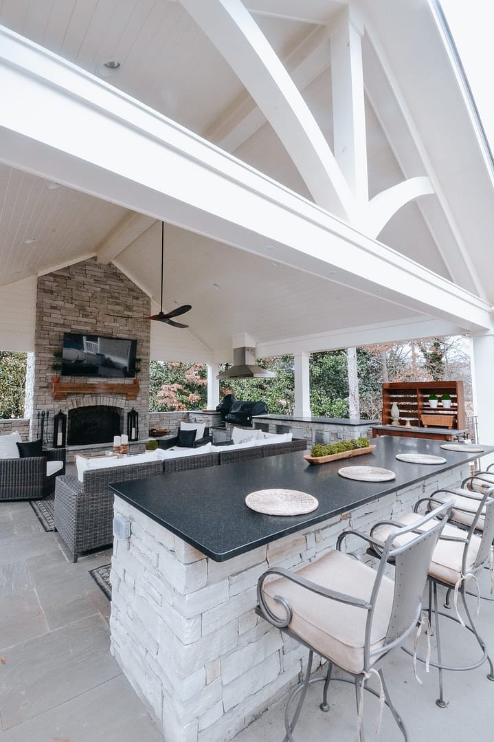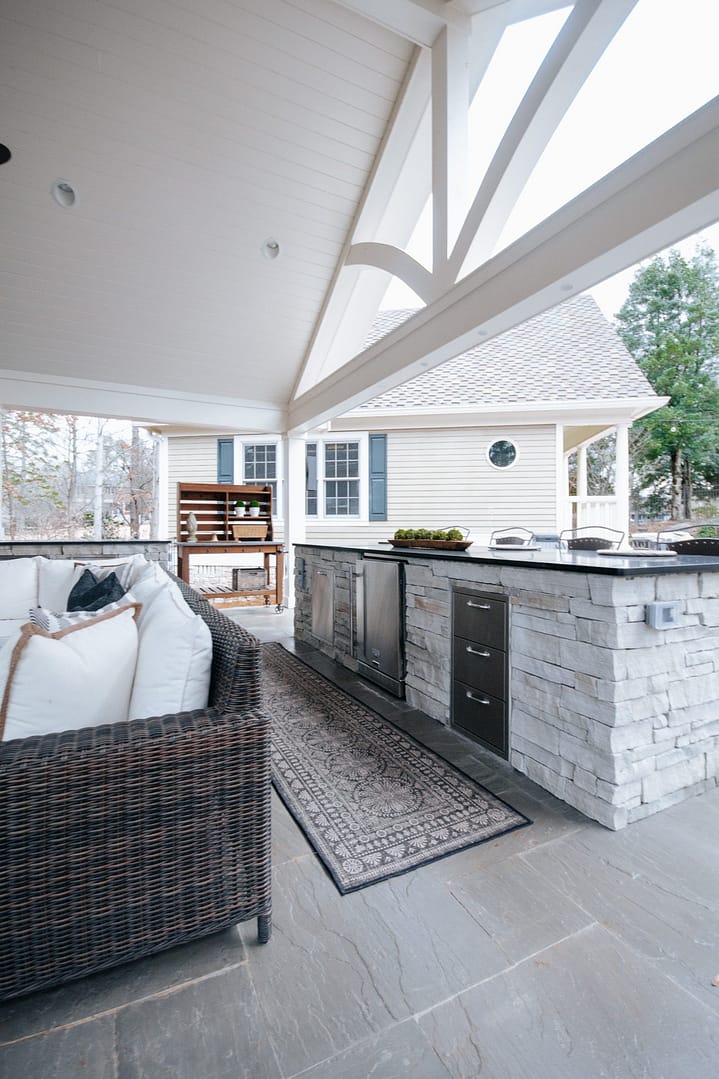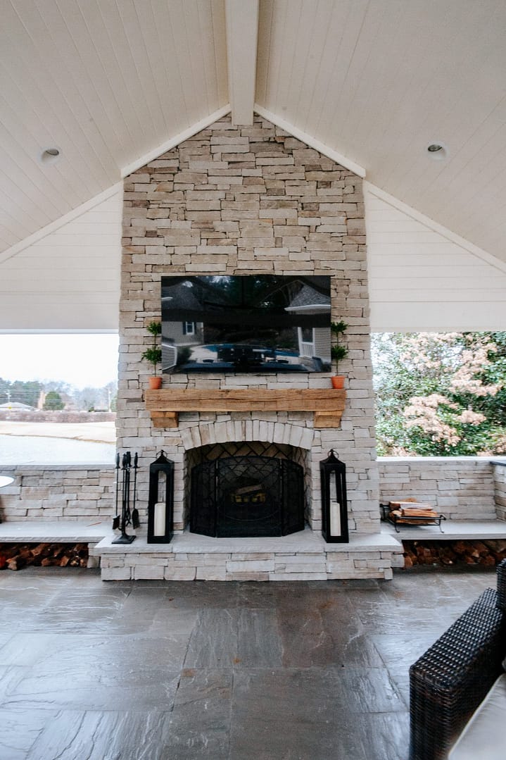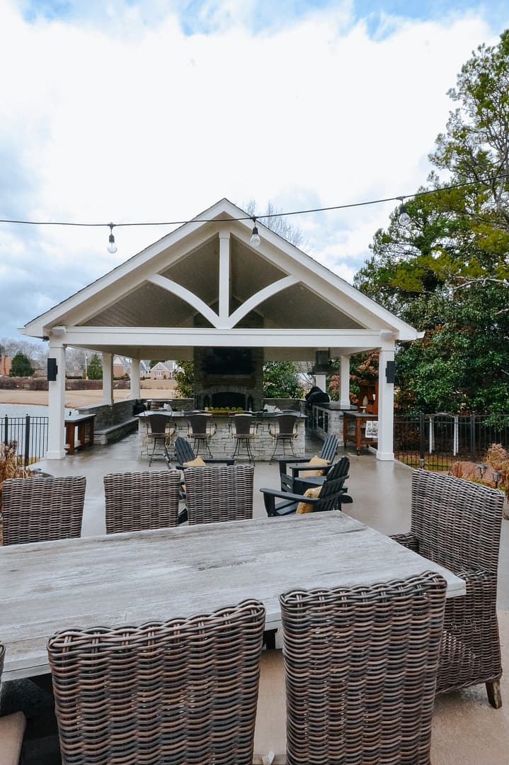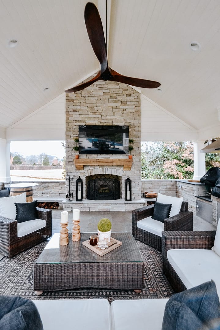 The missing piece for these Knoxville clients came in the form of a pavilion nestled between their home, guest house and pool. Overlooking their golf course backyard, this covered porch gives them a cozy place to enjoy their view during most of the year. An outdoor fireplace will give them warmth in the fall and winter, and a large island and outdoor kitchen will be the perfect spot for backyard barbecues in the spring and summer.