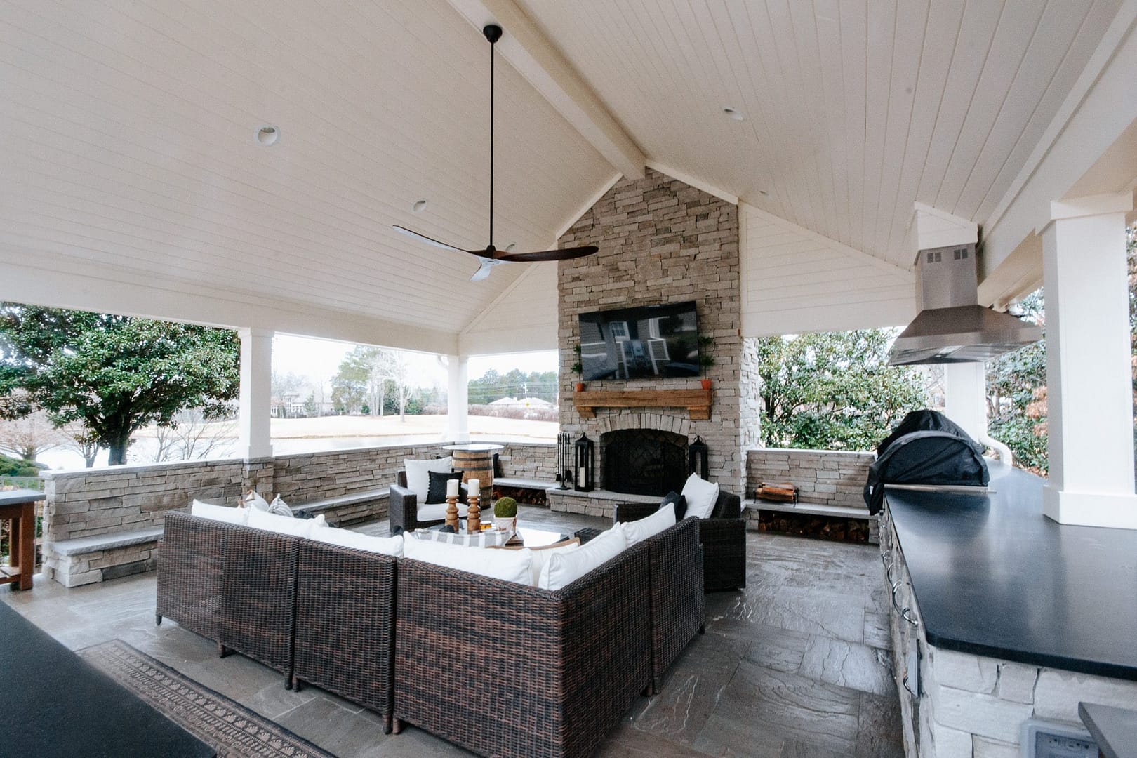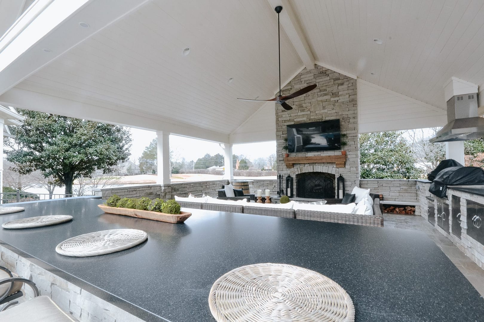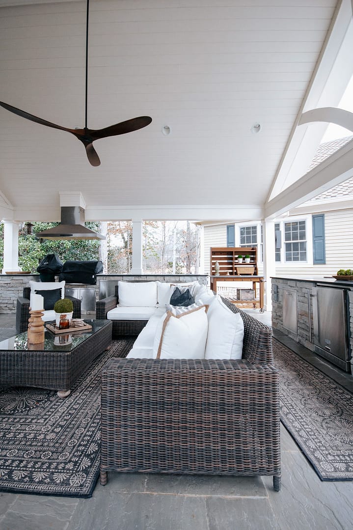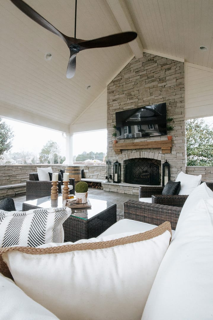 The missing piece for these Knoxville clients came in the form of a pavilion nestled between their home, guest house and pool. Overlooking their golf course backyard, this covered porch gives them a cozy place to enjoy their view during most of the year. An outdoor fireplace will give them warmth in the fall and winter, and a large island and outdoor kitchen will be the perfect spot for backyard barbecues in the spring and summer.