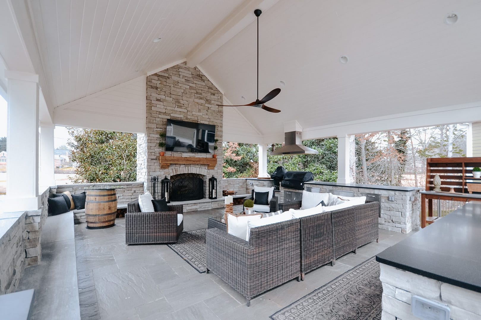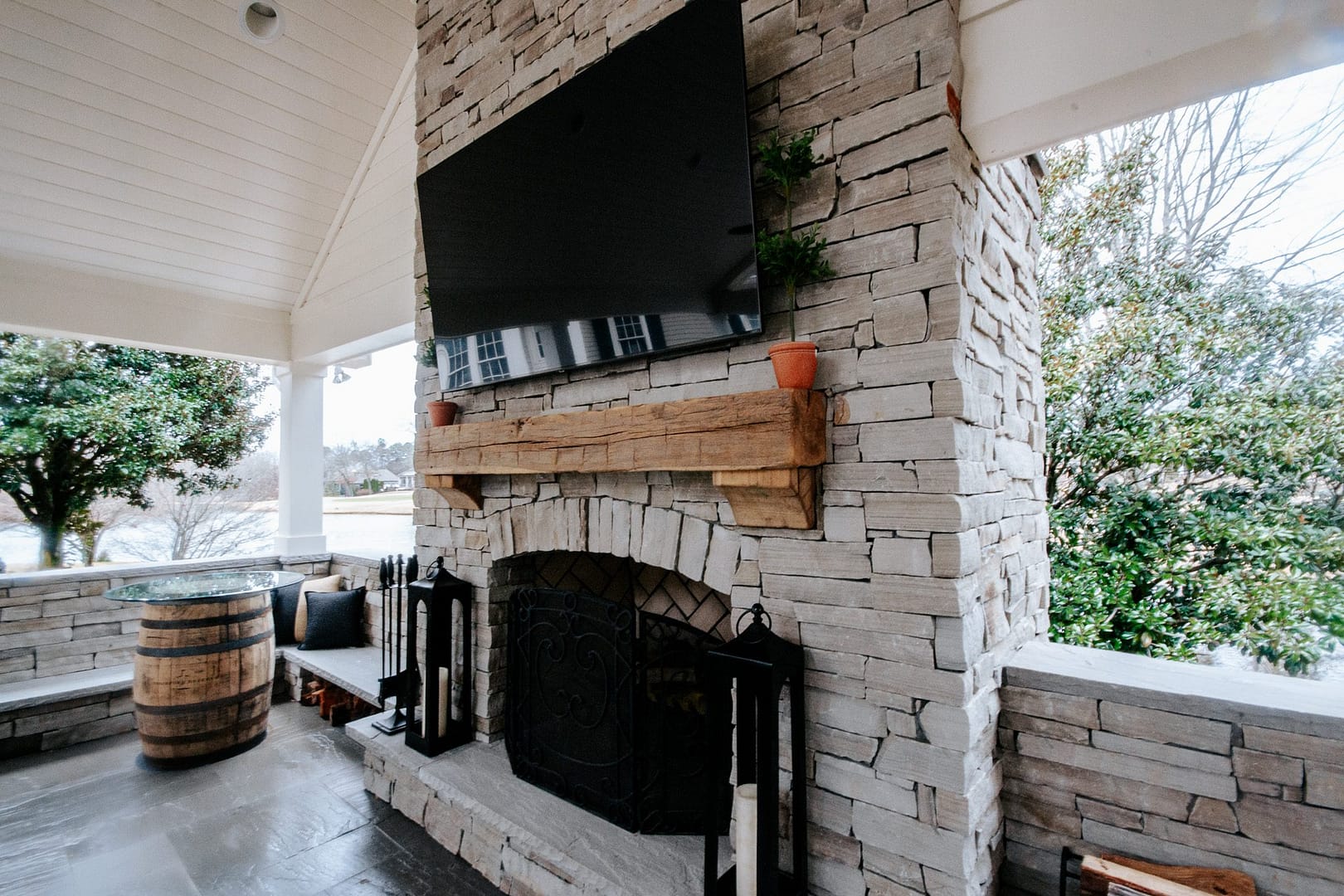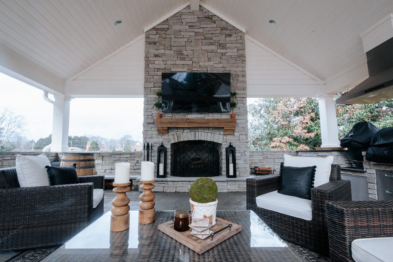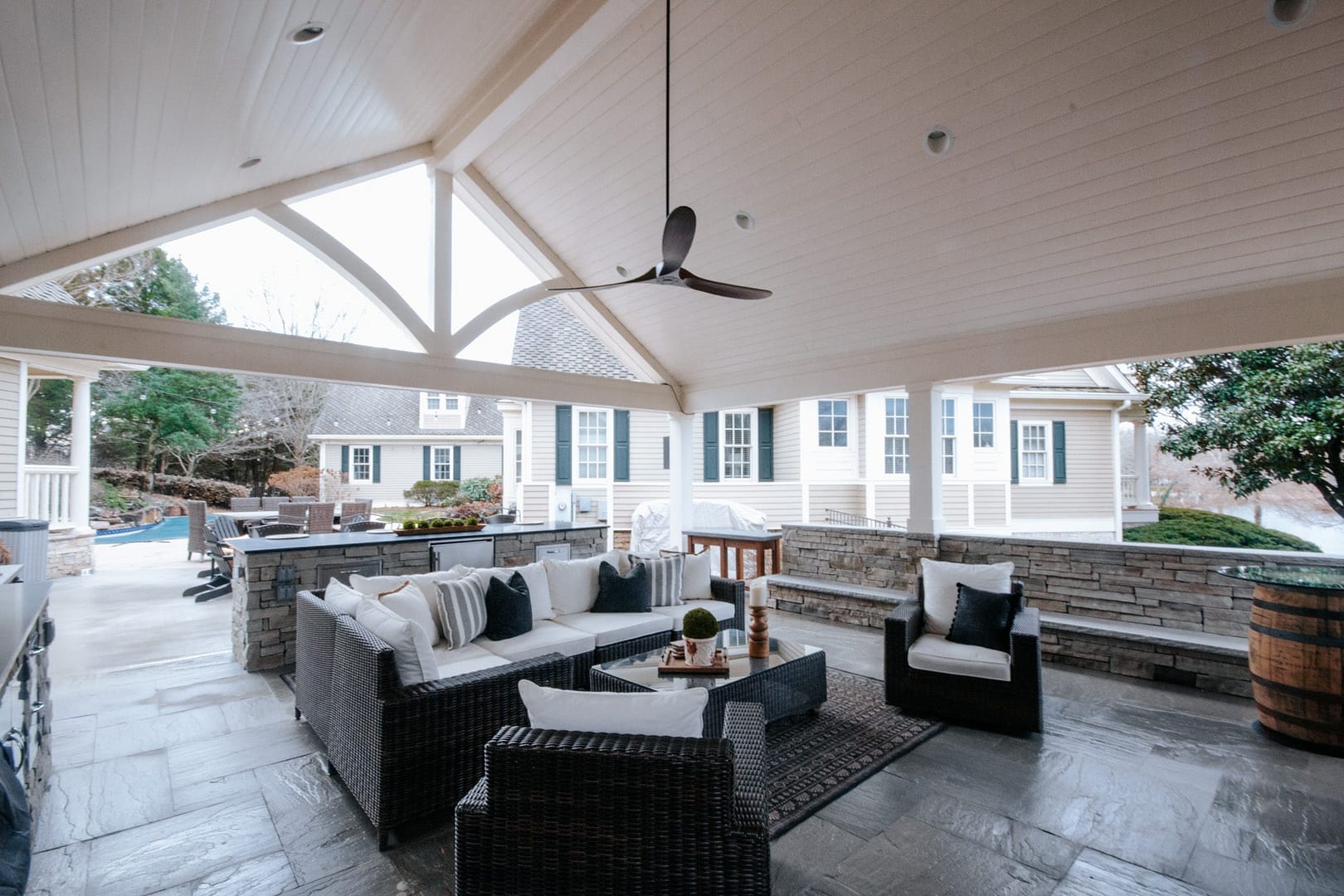 The missing piece for these Knoxville clients came in the form of a pavilion nestled between their home, guest house and pool. Overlooking their golf course backyard, this covered porch gives them a cozy place to enjoy their view during most of the year. An outdoor fireplace will give them warmth in the fall and winter, and a large island and outdoor kitchen will be the perfect spot for backyard barbecues in the spring and summer.
